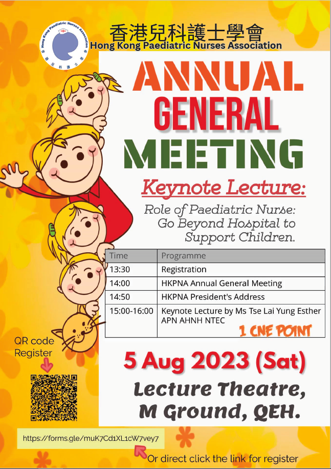 We are glad to annouce the Annual General Meeting 2023 of Hong Kong Paediatric Nurses Association will take place on 5 August, 2023. Kindly find the details below.